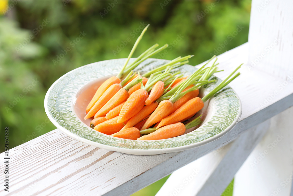Young peeled raw carrots in a green plate on the summer porch. Selective focus. #1721571338