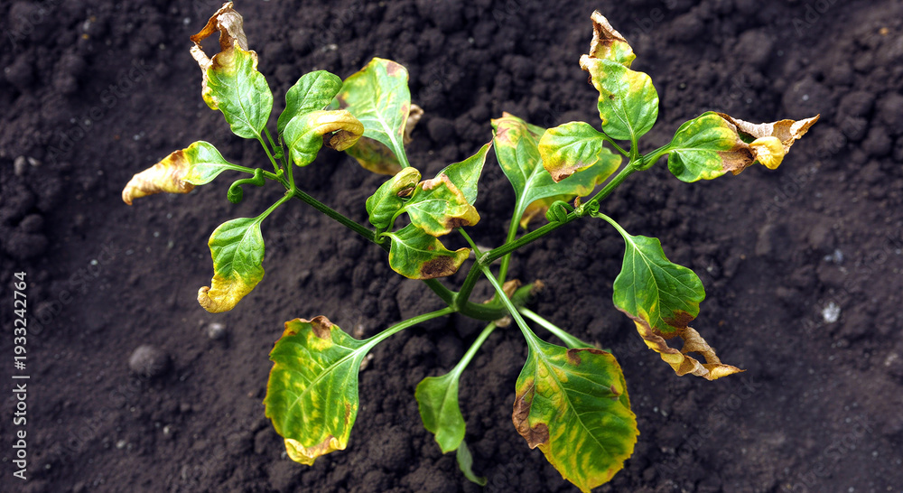 Young plant with yellowing leaves growing in dark soil #1933242764