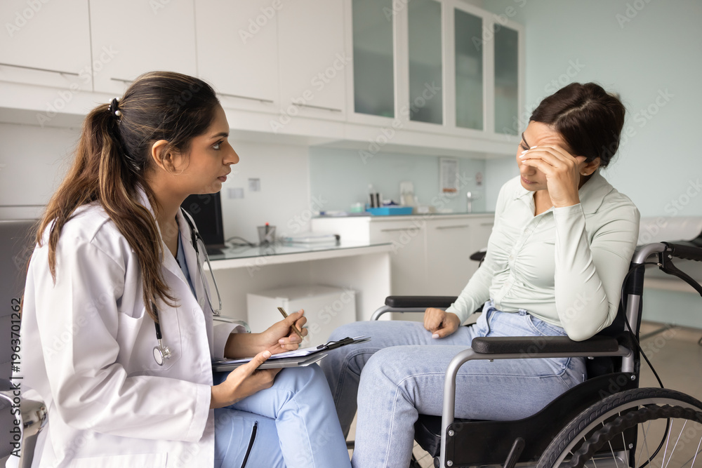 Young 30s Indian female psychologist or psychotherapist talks to worried woman in wheelchair during medical consultation, patient looks upset, need for psychological support, receiving disability care #1963701262