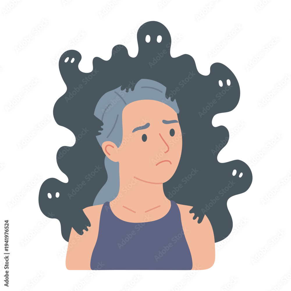 Young sad woman in fear with panic attack, stress, shock. Taking care of psychological health in case of anxiety, disorder, other mental problems. Shadow of fears. Vector illustration #1941976524