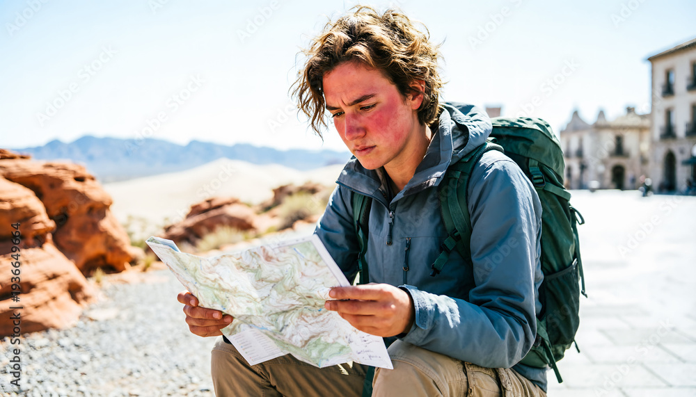 Young solo backpacker intensely studying a map while exploring a new city on a sunny day. #1936649664