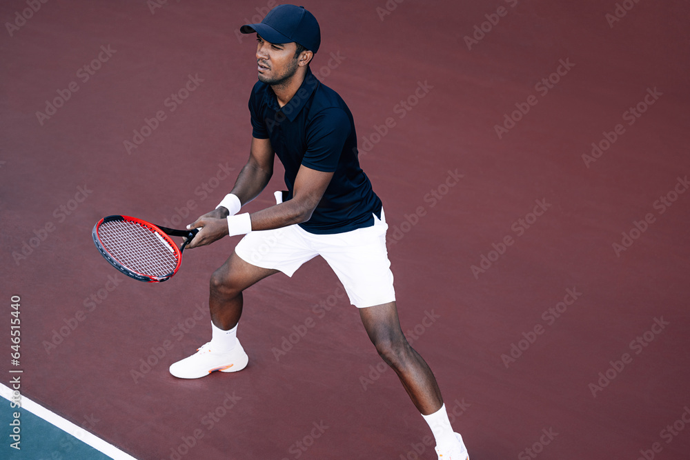 Young tennis player standing on the tennis court baseline ready to return the serve #646515440