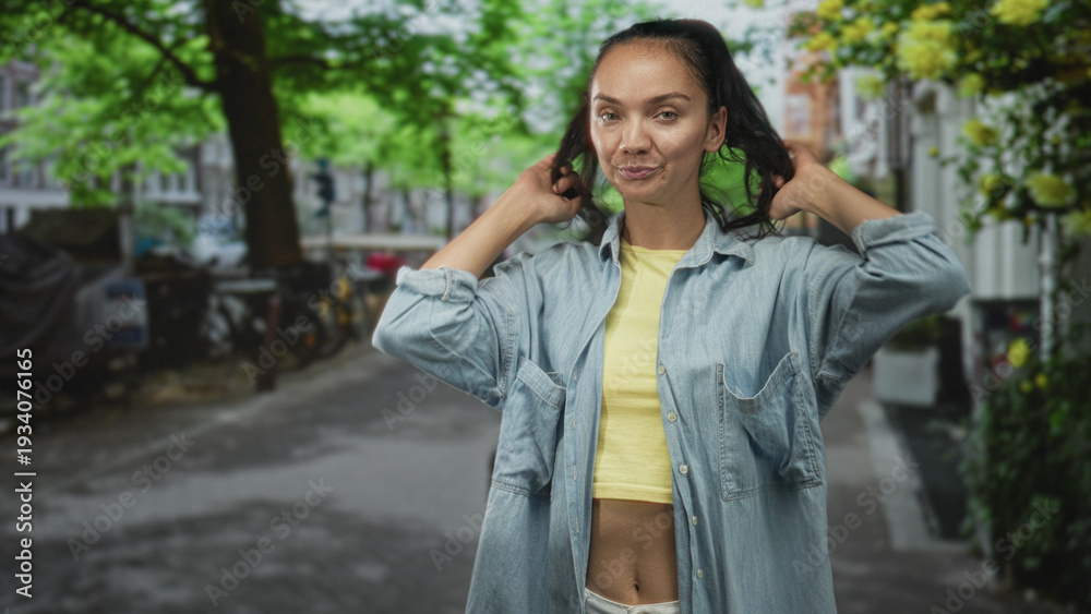 Young woman clapping hands and showing bare midriff on a tree lined street with bikes and planters; joyful. #1934076165