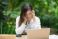 Young woman experiencing stress or frustration while working on a laptop in a serene outdoor environment surrounded by lush greenery and plants #1974164124