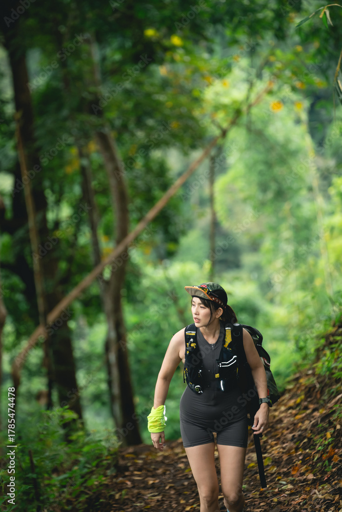 Young woman hiking through lush green forest, wearing sporty attire, enjoying outdoor adventure in vibrant nature, promoting healthy lifestyle and exploration #1785474478