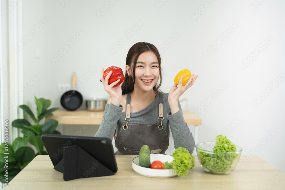 Young woman in casual kitchen holds red and yellow bell peppers while smiling, preparing healthy meal with fresh vegetables and tablet on table #1747586466
