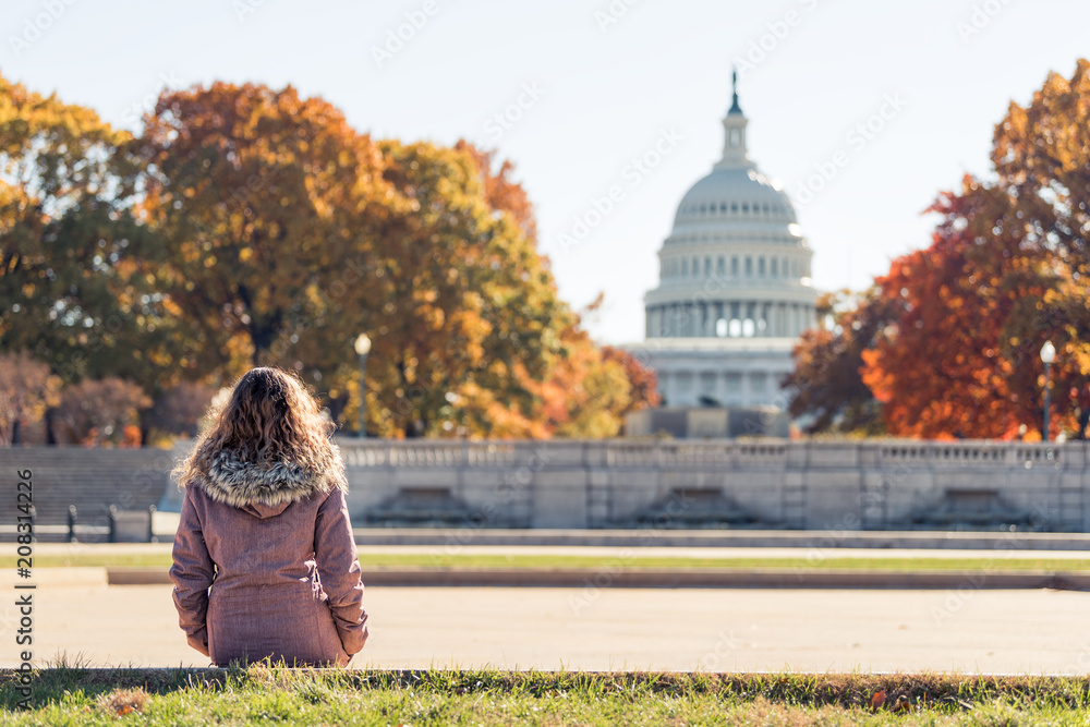 Young woman in coat sitting looking at view of United States Congress Capitol building, golden orange yellow foliage autumn fall trees on street during sunny day in Washington DC #208314226
