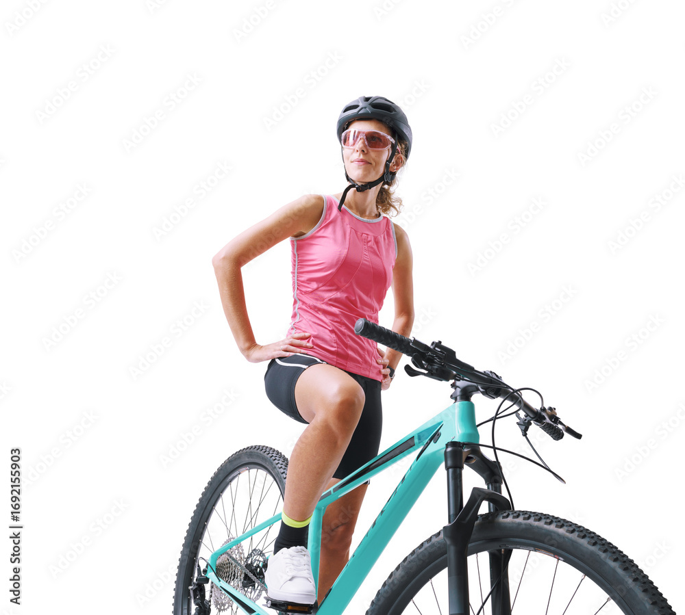 Young Woman In Professional Sportswear, Sitting Pose On Her Mountain Bike Against White Background #1692155903