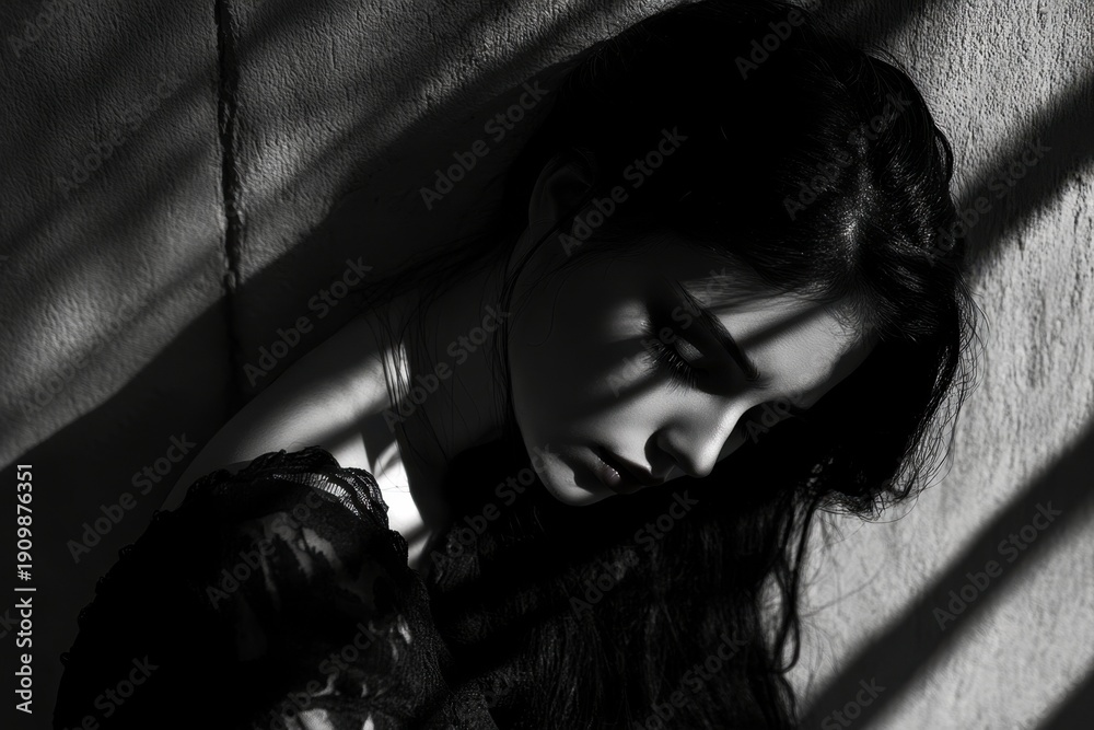Young woman in shadows reflecting deep emotions in a moody indoor setting during daylight hours #1909876351