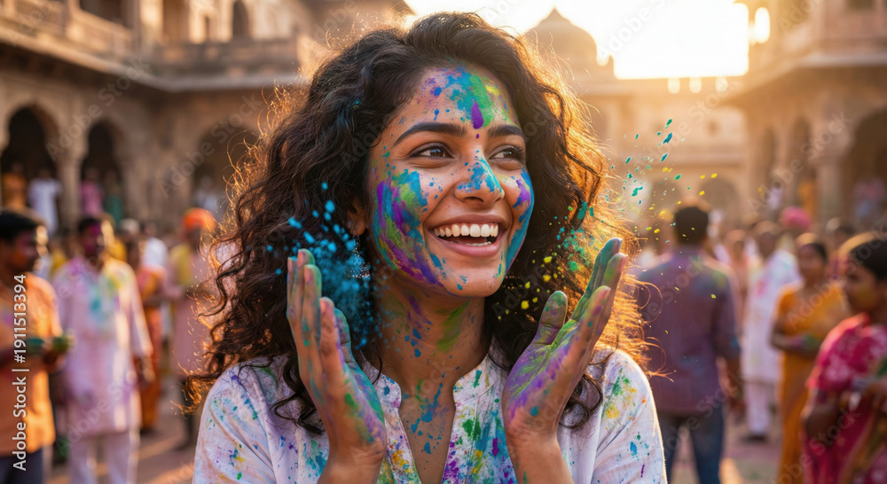 Young woman joyfully covered in vibrant colors during a holi festival celebration #1911513394