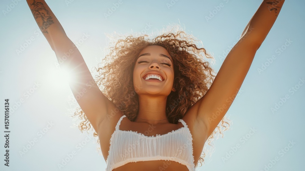 Young woman lifting hands up to show off clean and hygienic armpits or underarms. Smooth armpit cleanliness and protection concept #1570116134