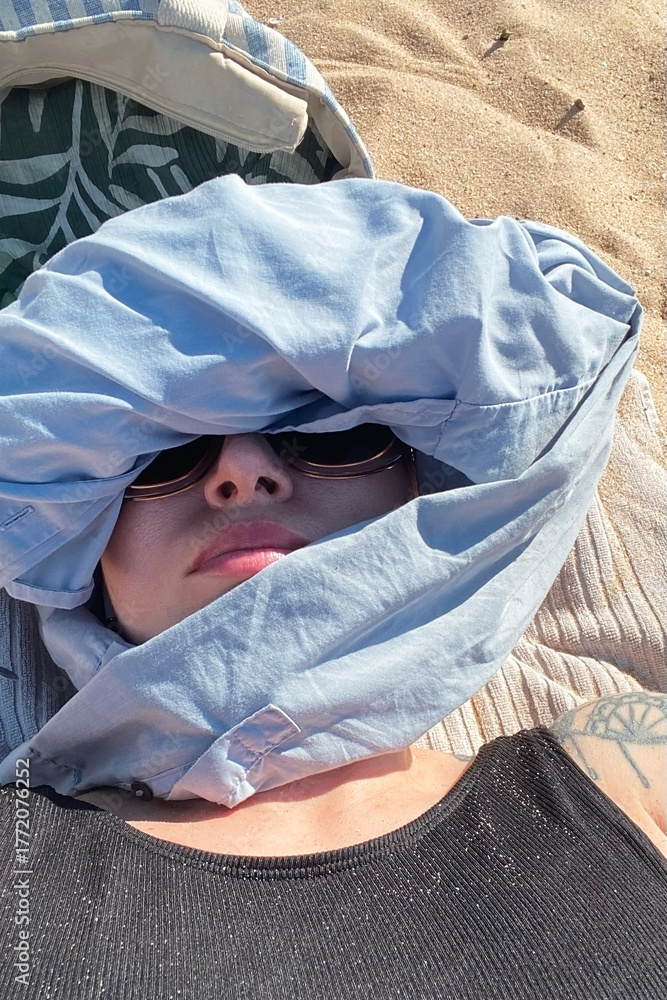 Young woman lying on beach sand with face wrapped in blue cloth and sunglasses, hiding from sun #1772076252