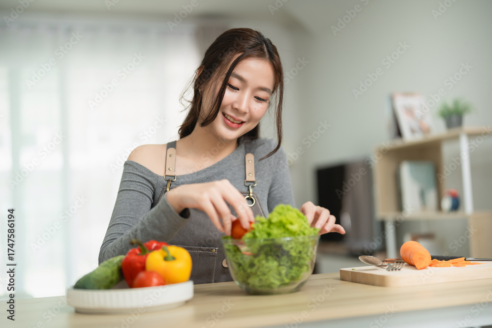 Young woman prepares fresh salad in modern kitchen with vibrant vegetables, enjoying healthy lifestyle and culinary creativity in home environment #1747586194