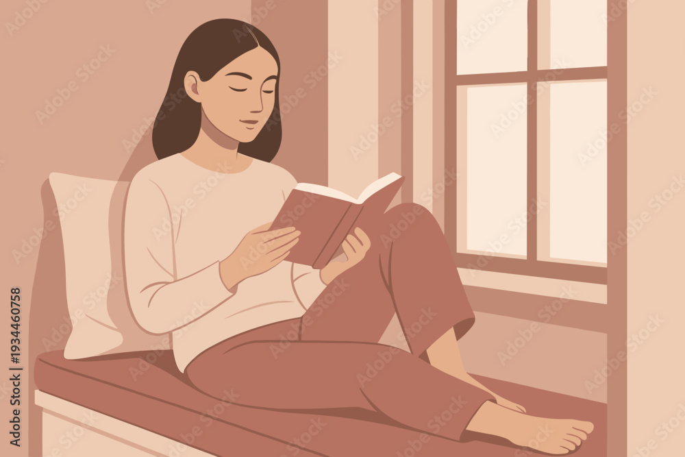 Young woman reading a book peacefully by the window in a cozy setting #1934460758