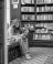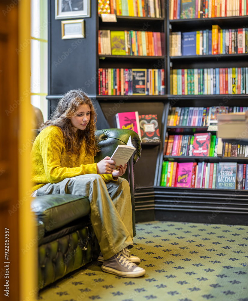 Young woman reading book with laptop on sofa in cozy library lounge interior #1922057557