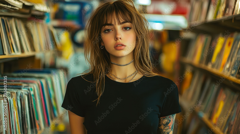 Young Woman Rock and Heavy Metal Fan in Black T-Shirt Browsing in Record Store Alley Vibrant Urban Lifestyle Concept #1795087335