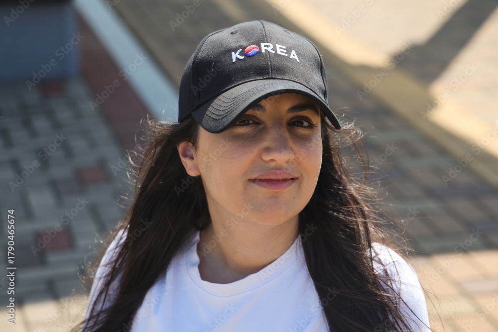 Young woman smiling, wearing a black Korea baseball cap #1790465674