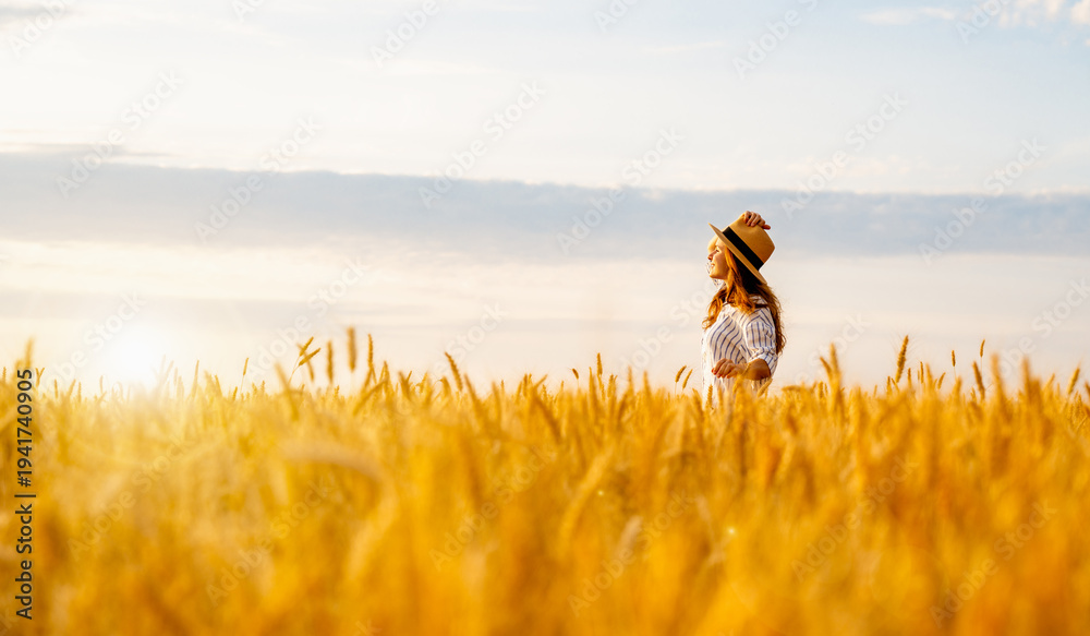 Young woman standing in agricultural field enjoying rural landscape. Agritourism lifestyle. #1941740905