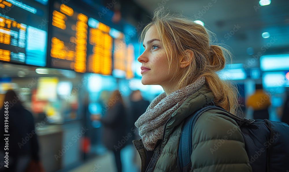 Young woman traveler in winter coat and scarf looking at airport departure and arrival digital flight information board with blurred background people and bright screens #1819658455