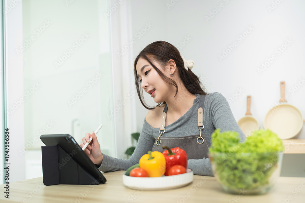 Young woman using digital tablet in modern kitchen while preparing healthy meals with fresh vegetables and fruits, lifestyle, technology, cooking #1747586384