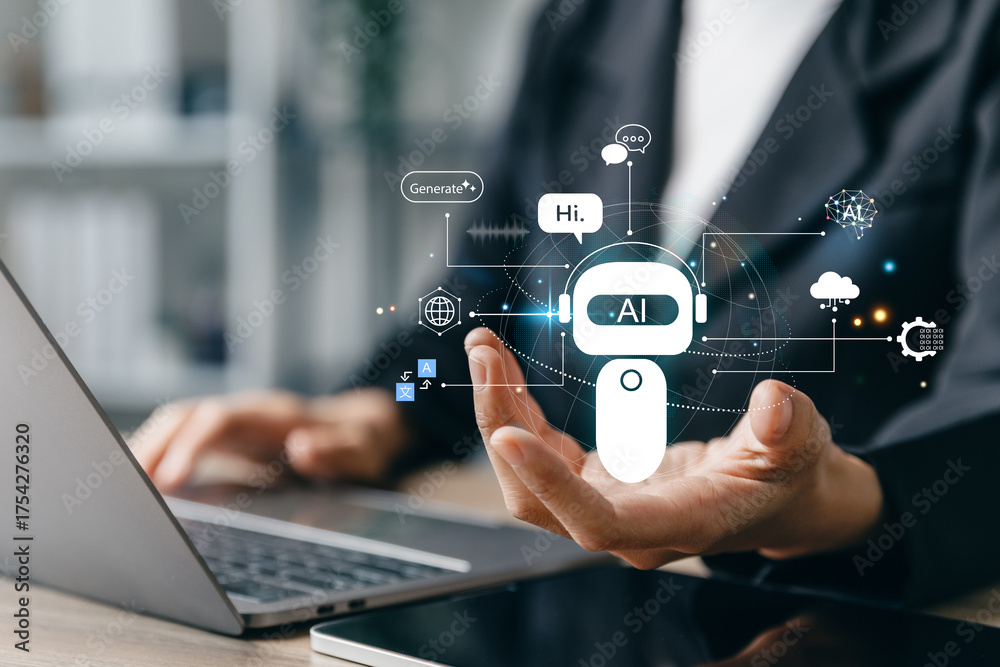 Young woman using laptop with Ai assistant. command to create something. #1754276320