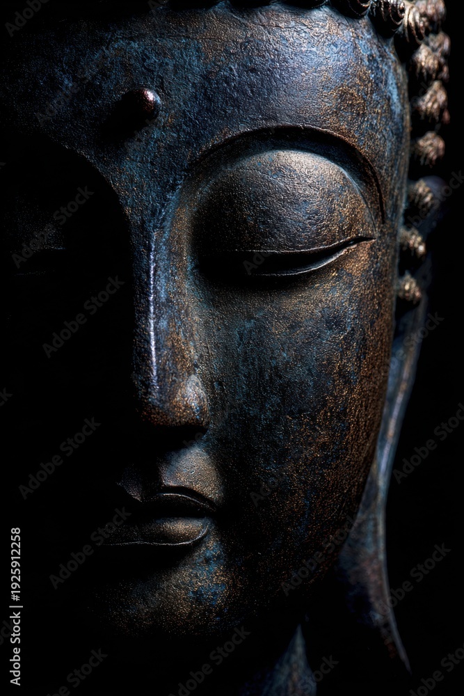 Zen Buddhism, meditation, inner peace, Chinese Japanese Asian tradition. Therapy stress release treatment, health lifestyle. A closeup of a bronze Buddha statue with a serene expression. #1925912258