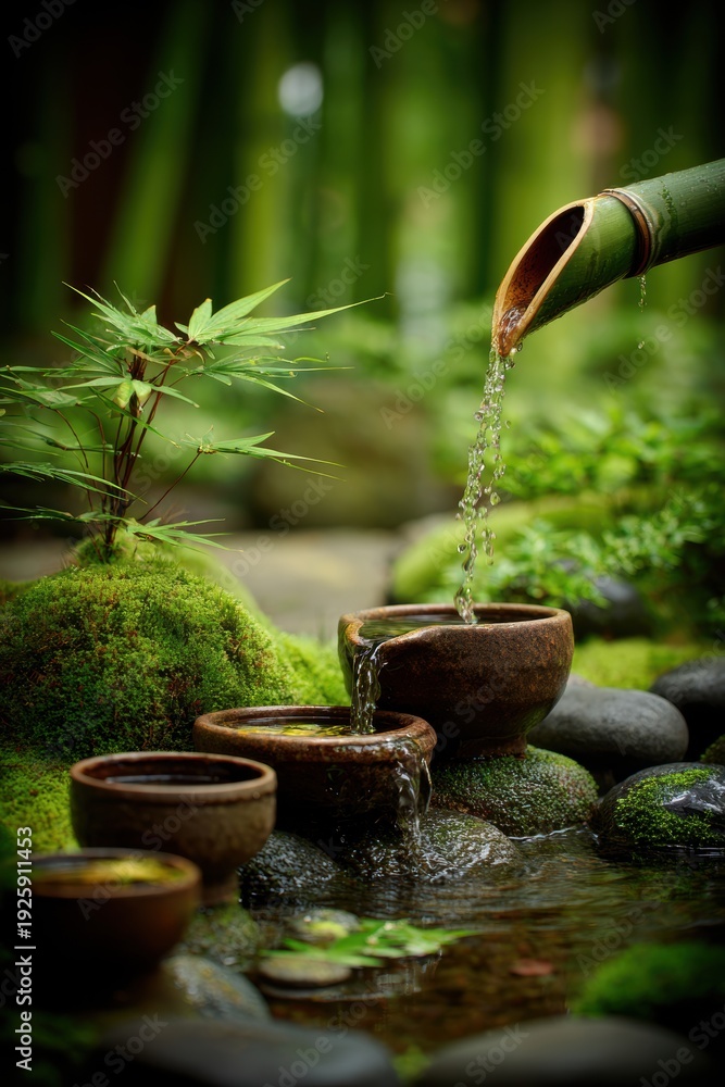 Zen Buddhism, meditation, inner peace, Chinese Japanese Asian tradition. Therapy stress release treatment, health lifestyle. A tranquil Japanese garden with a bamboo tree, mosscovered rocks. #1925911453