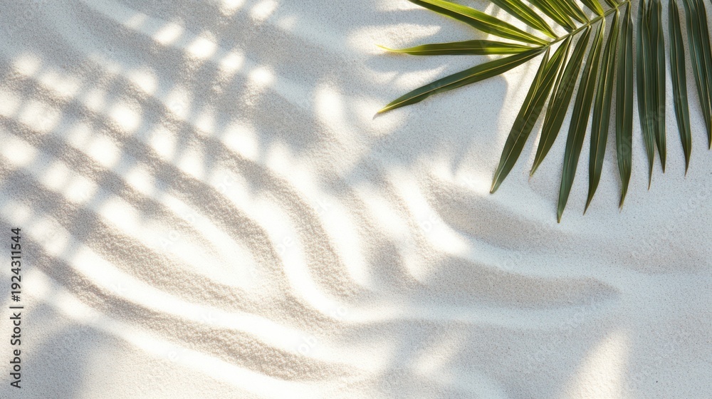 Zen pattern raked in fine white sand with delicate palm leaves casting soft shadows, tranquil spa and meditation concept for wellness branding and presentation background #1924311544