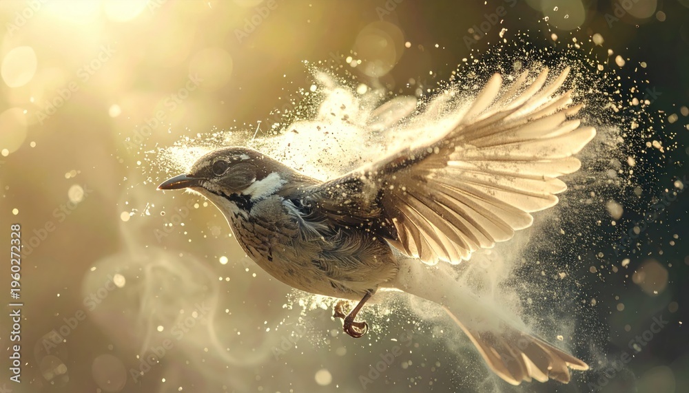 A bird in flight, dissolving into particles of light against a blurred, golden background #1960272328