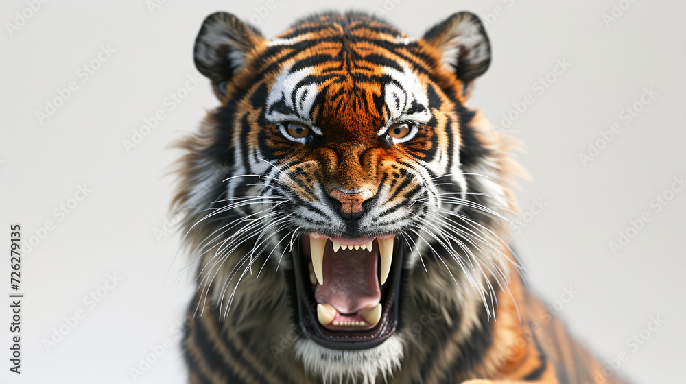 A breathtaking, hyper-realistic 3D rendering of a fierce tiger, rendered in stunning detail and set against a crisp white background. This captivating artwork showcases the immense power and #726279135
