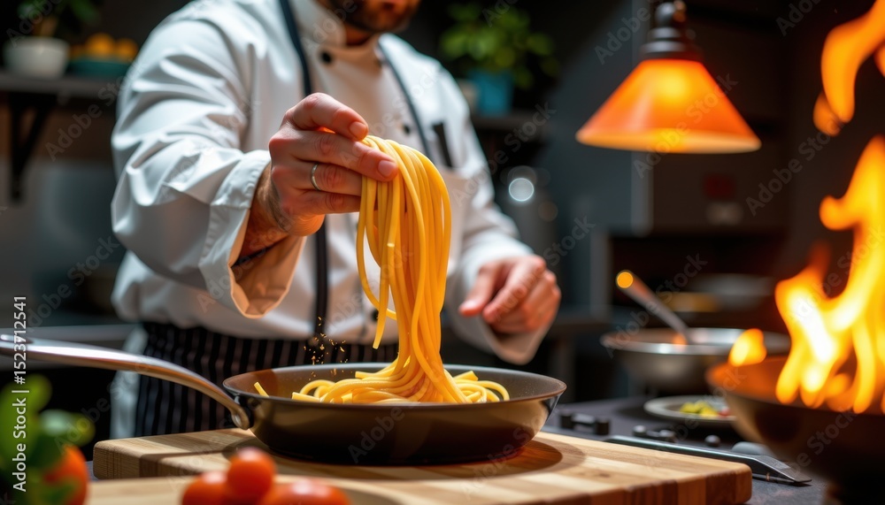 A chef prepares fresh pasta in a pan over a stove with visible flames in a cozy kitchen setting. #1523712541