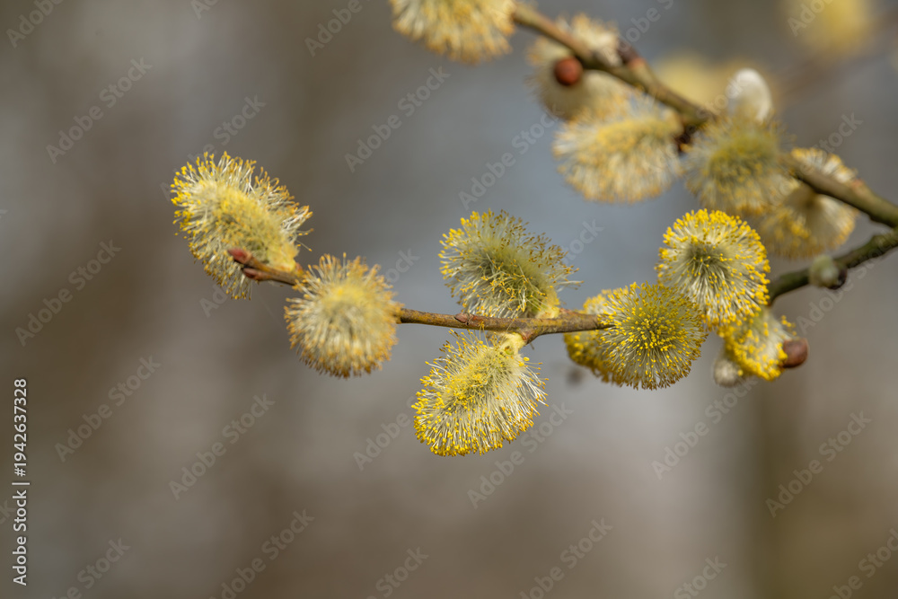 A close-up of flowering willow catkins in March. A sign of the beginning of spring. Sunny winter day, early spring, spring feeling, beautiful weather. Willow pollen, the start of allergy season. Aller #1942637328