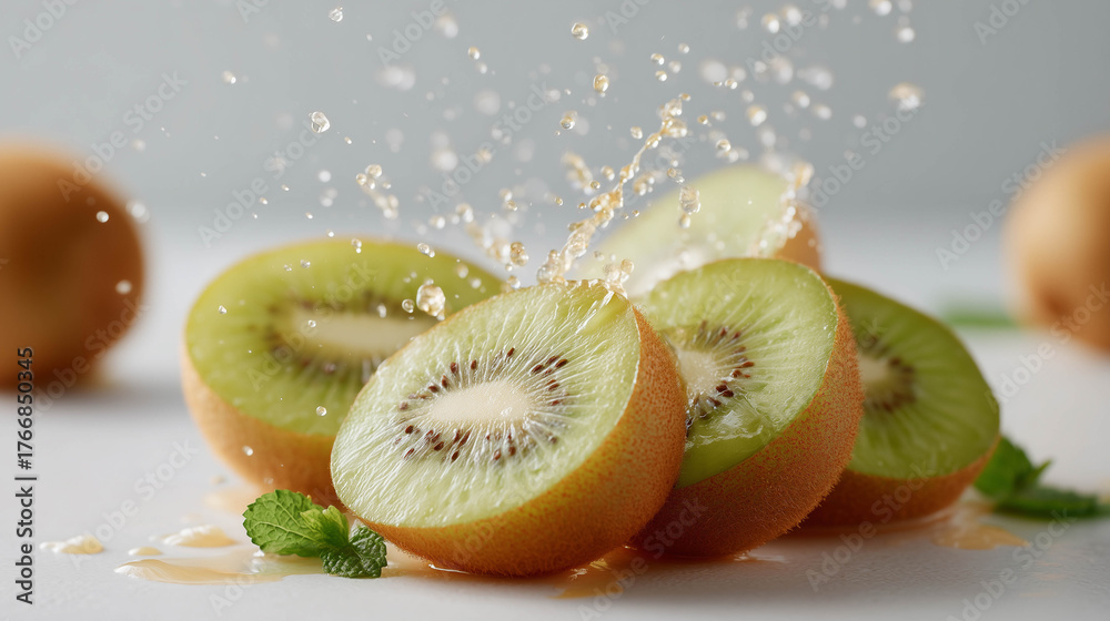 A close-up of freshly sliced kiwi with juice splashing mid-air against a white background. #1766850345