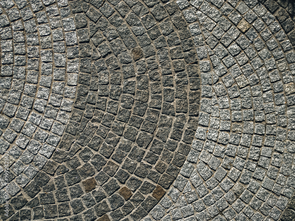 A close-up of gray granite pavers laid in a semicircular arc. A concept for a durable natural stone flooring solution. #1972425173