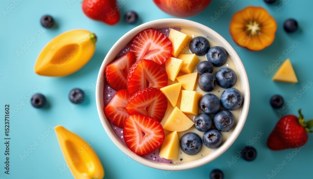 A colorful smoothie bowl topped with strawberries, blueberries, and mango, surrounded by fresh fruits on a blue background. #1523711602