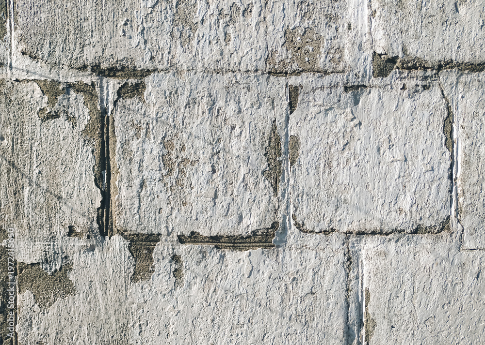 A cracked, light gray, almost white cinder block wall coated with acrylic-based chalk-lime paint. The texture of the old stone surface. Close-up. #1972415650
