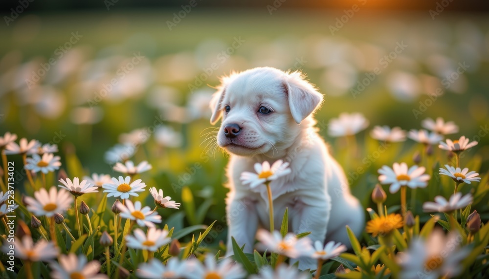 A cute puppy sits among blooming daisies in a sunlit field, creating a warm and peaceful springtime scene. #1523713402