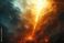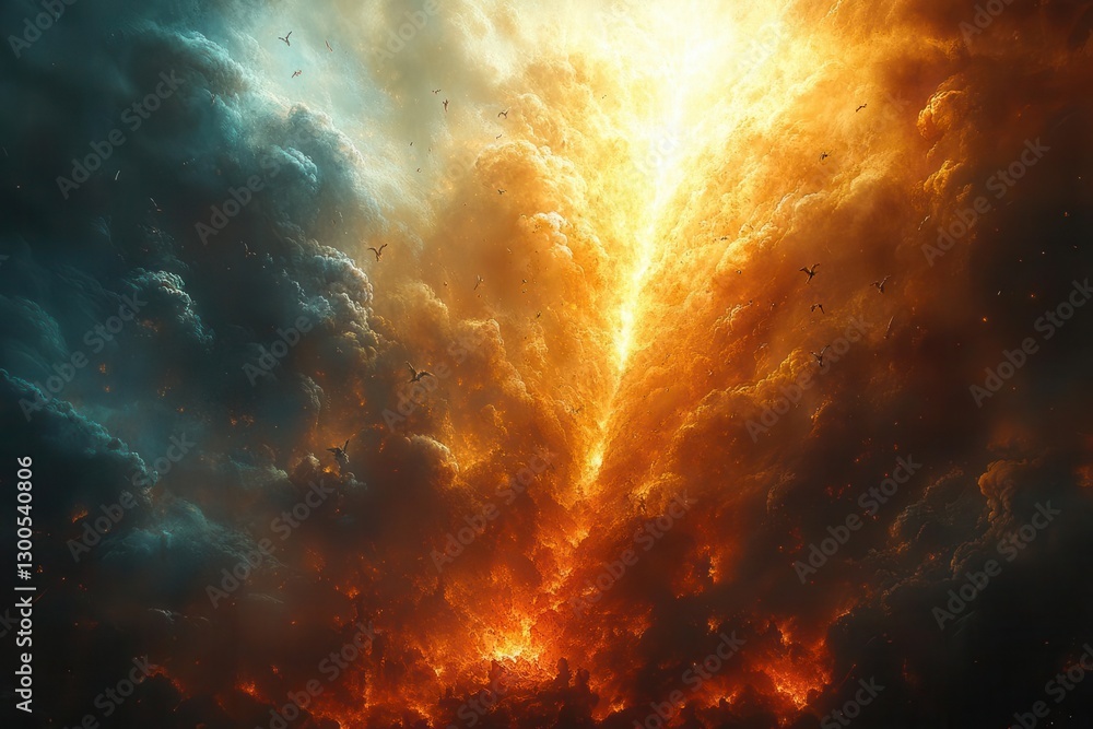 a dramatic vertical composition split between a luminous celestial realm with golden light and floating angels above and a dark underworld with fire and shadowy figures below #1300540806