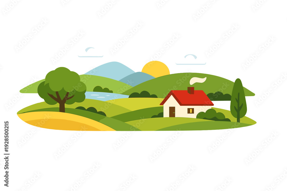 A flat vector illustration of a peaceful rural landscape featuring a small white house with a red roof, rolling green hills, a blue lake, and mountains under a sunny sky with clouds. #1928500215