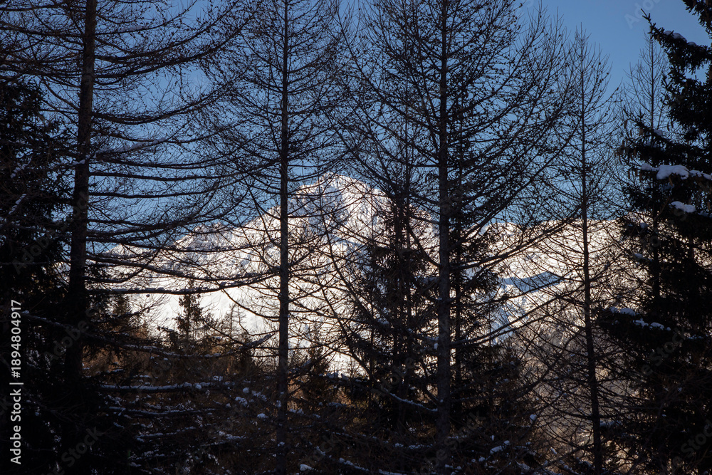 A glimpse through the larch treetops of Mont-Cenis, a stunning massif in the French Alps #1894804917