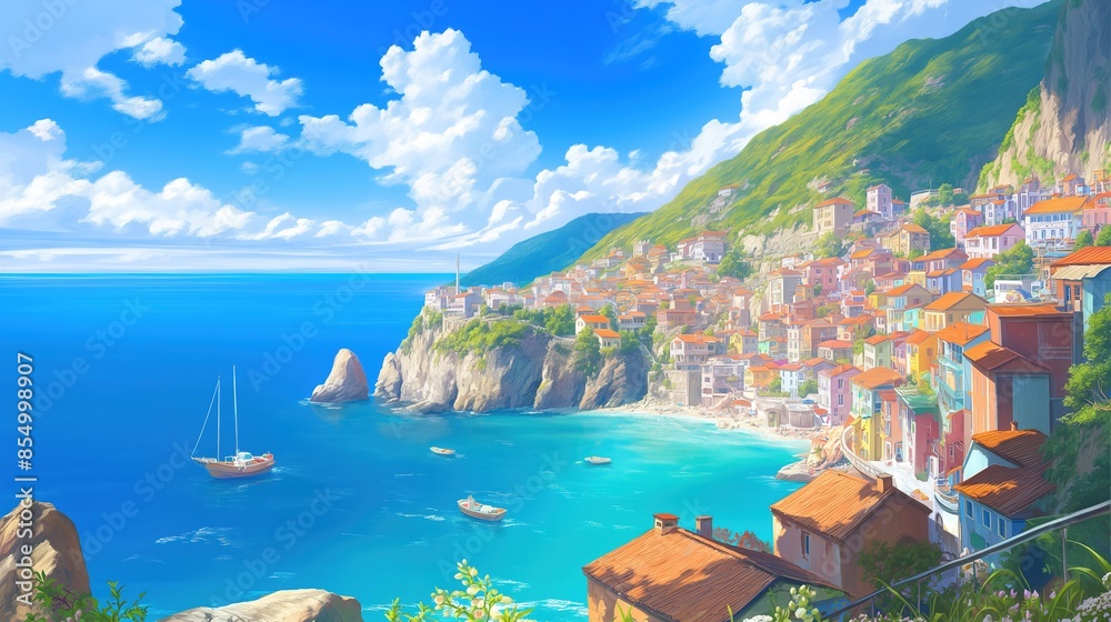a landscape of a Meditteranean coastline in summer, illustration in the style of anime #854998907