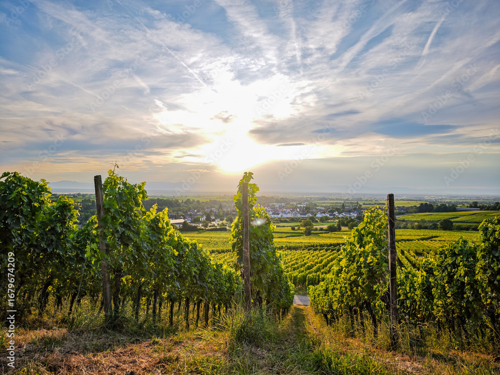 A lush green vineyard with a hill in the background in Germany Breisgau #1679674209