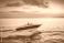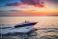 A motorboat sails ove the calm ocean with high speed during sunset time #1699807080