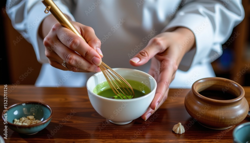 A person prepares matcha tea using a bamboo whisk, surrounded by traditional tea utensils on a wooden table. #1523711126