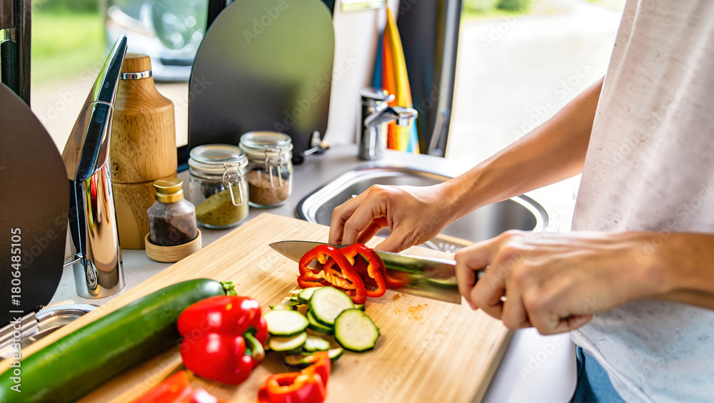 A person preparing a healthy meal in a camper van kitchen. Embracing the nomadic "van life" travel lifestyle with off-grid cooking and simple living. #1806485105