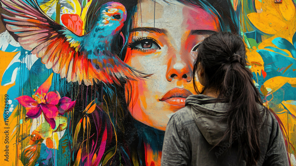 A person views vibrant mural of a woman's face with a bird #1765142959
