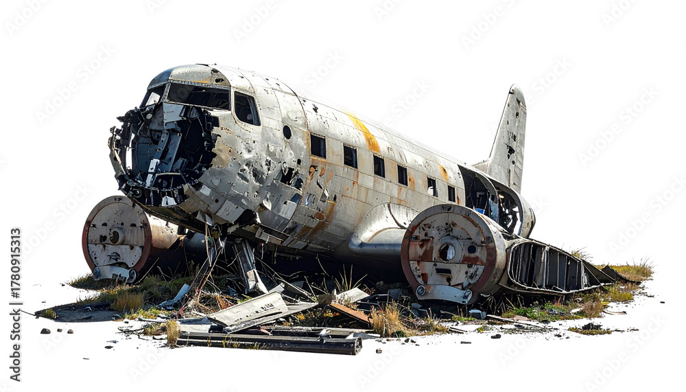 A realistic PNG of a broken airplane, showing visible damage and worn surfaces. Perfect for crash concepts, danger illustrations, repair themes, accident awareness, and dramatic scene compositions. #1780915313
