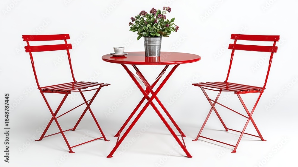 A red table with two chairs and a potted plant in front of it. The potted plant is placed in the center of the table, adding a touch of greenery to the scene #1848787445