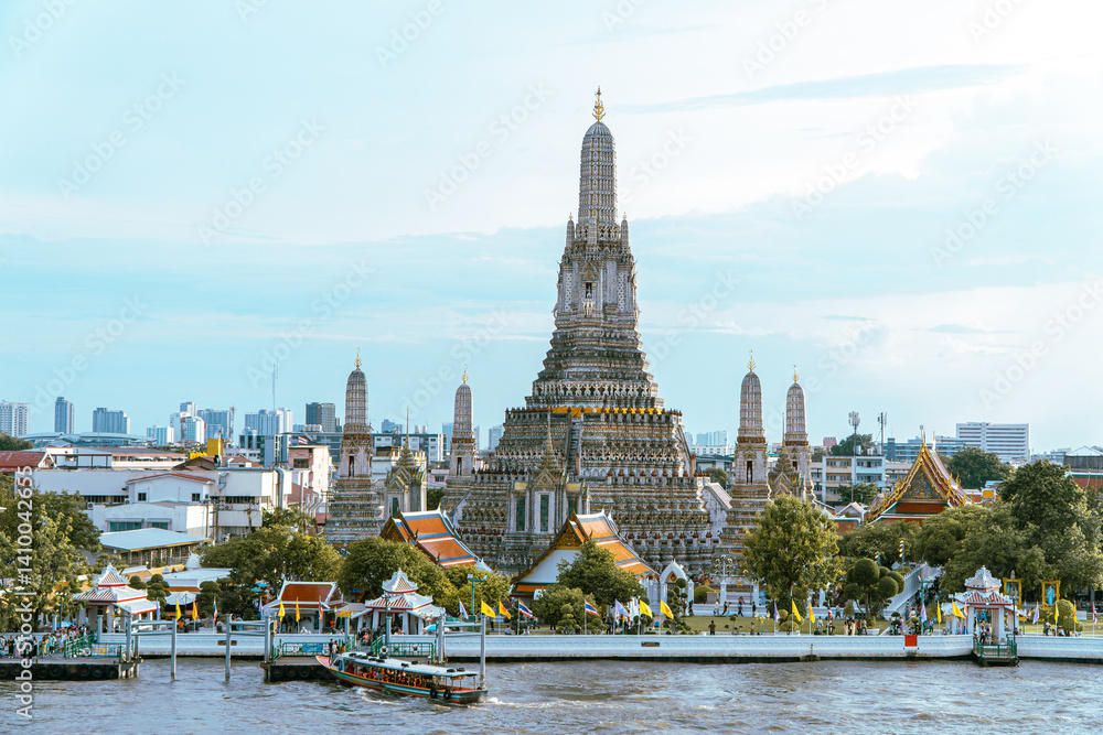 A scenic riverside view containing the beautiful temple in Bangkok, Wat Arun Ratchawararam Ratchawaramahawihan, which rises majestically from the Chao Phraya River #1410042655