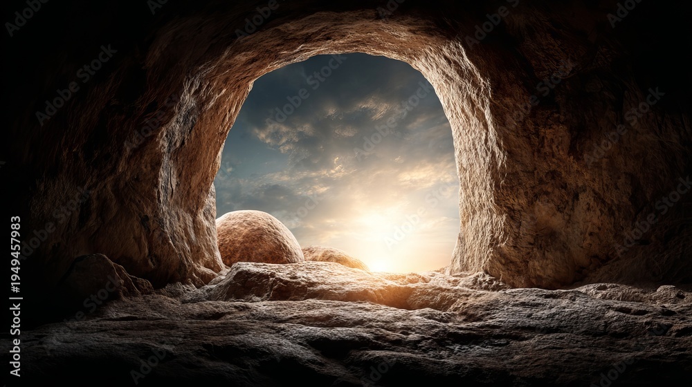 A serene cave entrance with a large stone rolled away, revealing a bright sunny sky with clouds. #1949457983